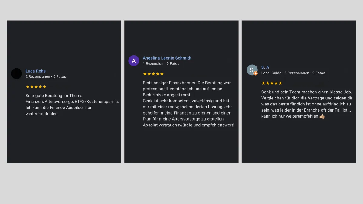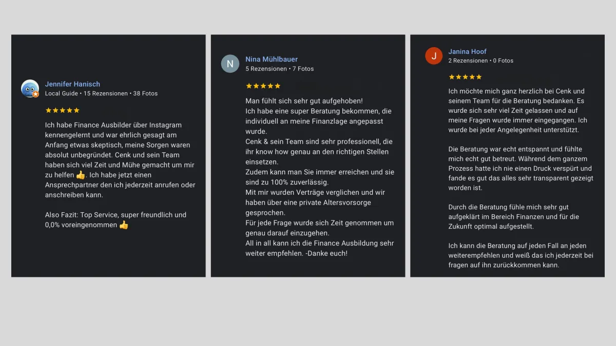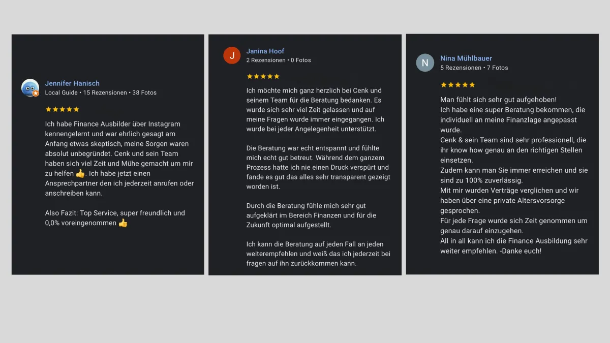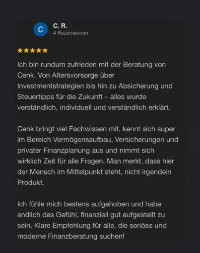 Gemeinsam mit seinem Beraterteam hilft er heute deutschlandweit Menschen dabei, ihre Finanzen zu verstehen, clevere Entscheidungen zu treffen und langfristig Vermögen aufzubauen - ehrlich, verständlich und ohne Verkaufsdruck.